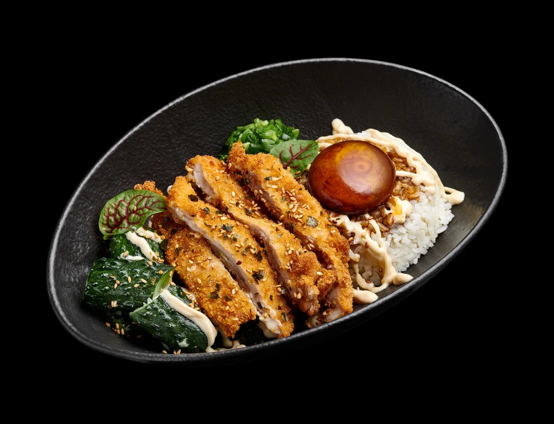 Рис, соус понзу, лук, маринованный желток, кунжутные специи, битые огурцы, соус трюфельный унаги, хрустящая отбивная из курицы